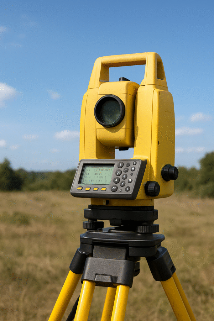 🔹 Theodolite: Measures horizontal and vertical angles accurately.